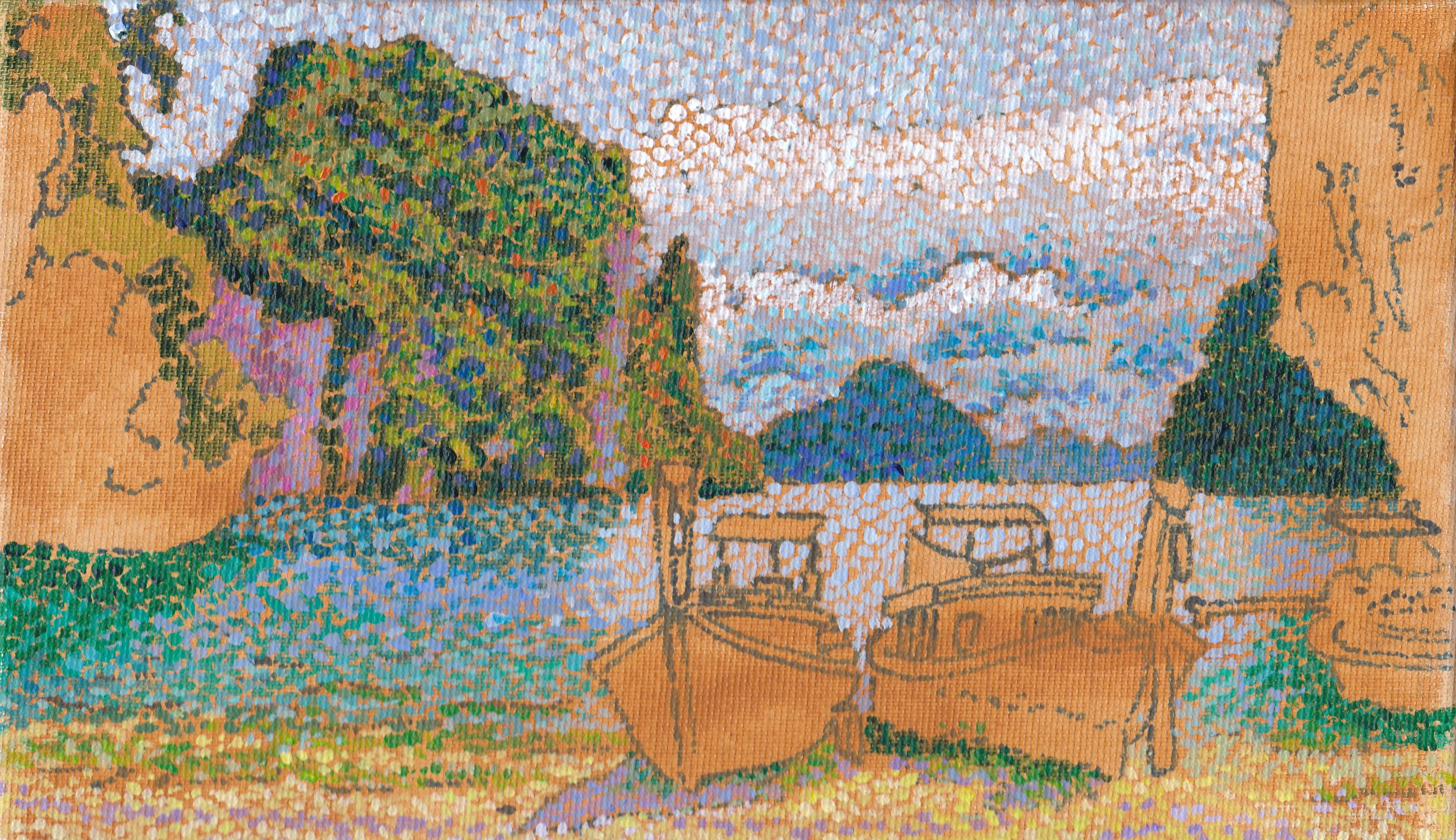 J'ai travaillé sur un très petit format 3M. J'aime beaucoup les tout petits formats. Mon souci a été de créer une peinture pointilliste qui aurait la luminosité des œuvres de Paul Signac. Je n'ai pas utilisé d'étude préparatoire.